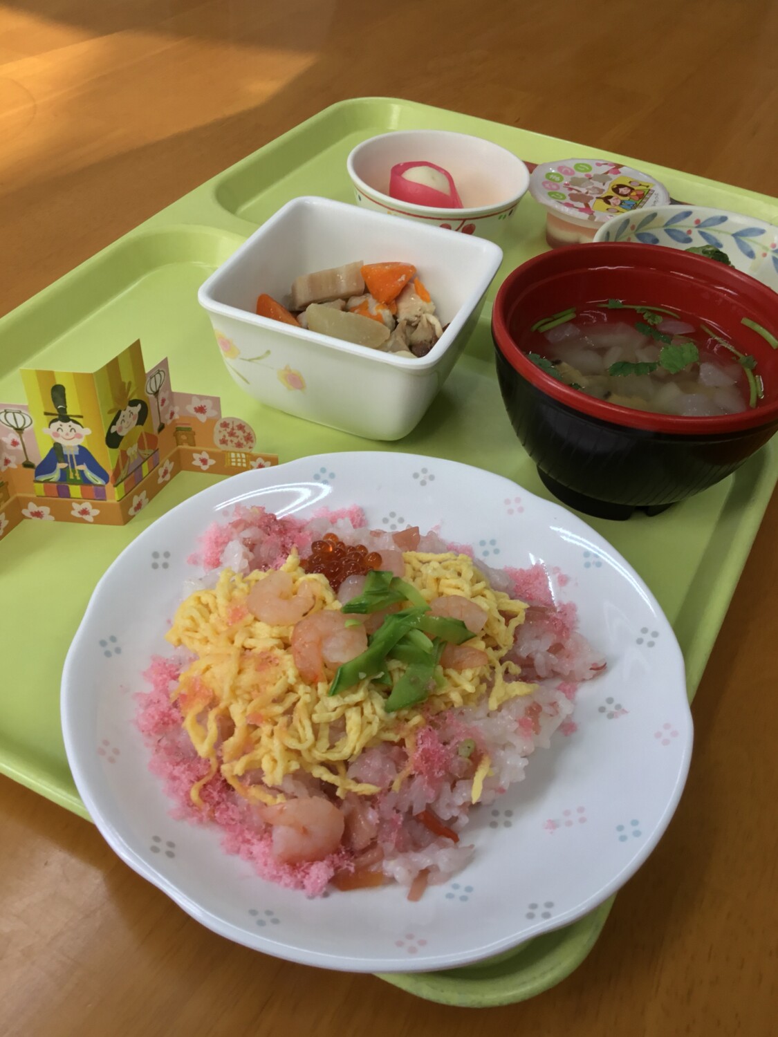 3月3日は桃の節句。おいしそうなちらし寿しとかわいい飾りのついた昼食でした。