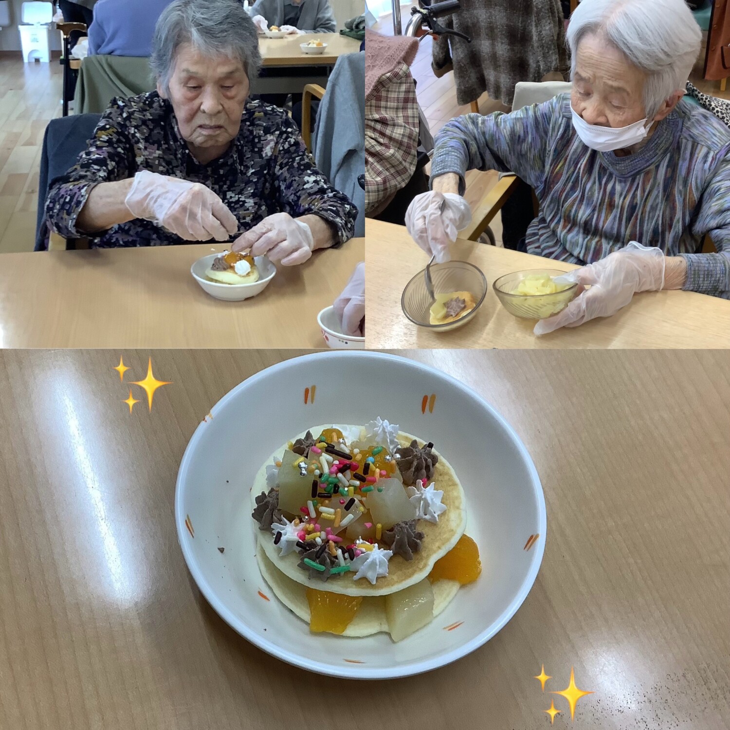 パンケーキ🥞を使用し、フルーツやクリーム、チョコレート等がたっぷりと入った特製ケーキです🤤🍐🍊
