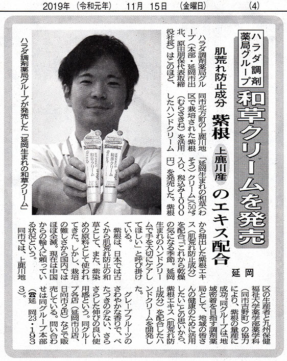 私たちの地元・延岡では、宮崎県の山間部、豊かな清流と四季折々の自然が残る「上鹿川」の生産者と九州保健福祉大学薬学科が協力し、日本で初めて紫根の量産に成功しました。私たちは、肌荒れ等に昔から重宝されてきた紫根を地域の皆様の健康のために活用したいと思い、紫根エキス(肌荒れ防止成分)を配合したハンドクリームを開発しました。